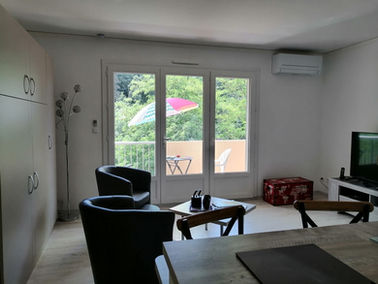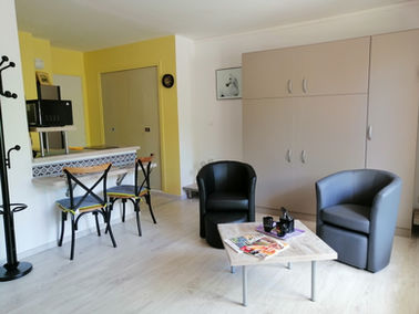 1 pièce à vivre avec cuisine équipée, micro-ondes combiné four, réfrigérateur-congélateur, lave linge, lit relevable avec matelas tout confort, draps fournis,